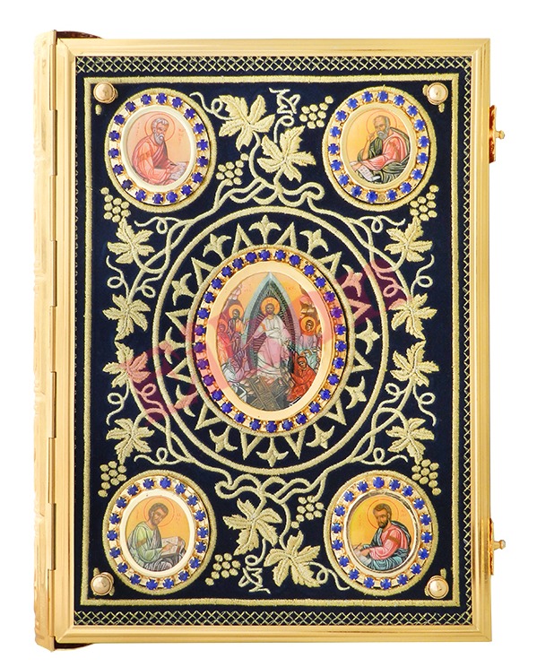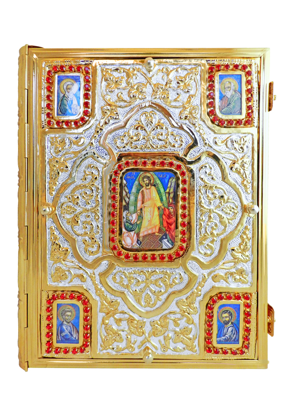 Evanghelie aurită – argintată, engolpioane cu pietre albastre sau roșii. Dimensiune 28×36 cm.
