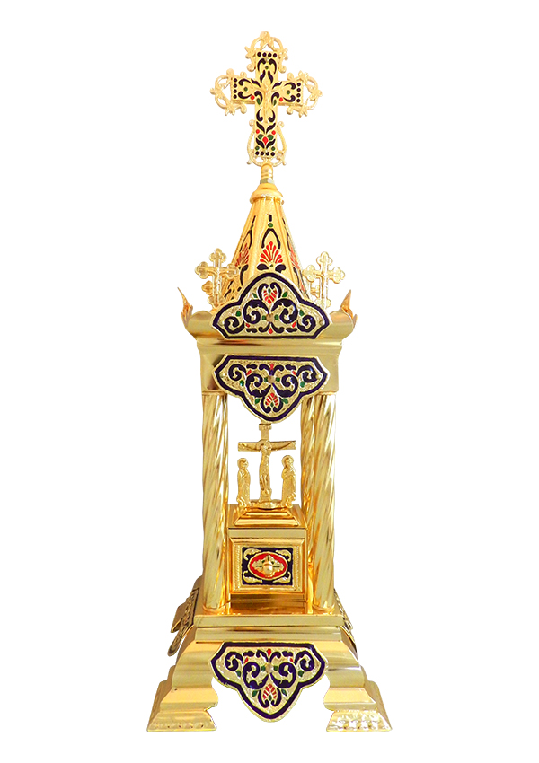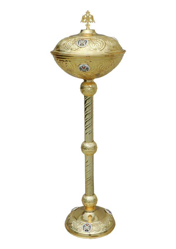 Vas cu picior, pentru anafură – aurit, gravat, cu medalioane de email.