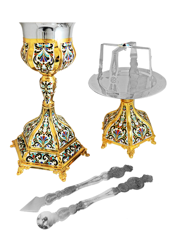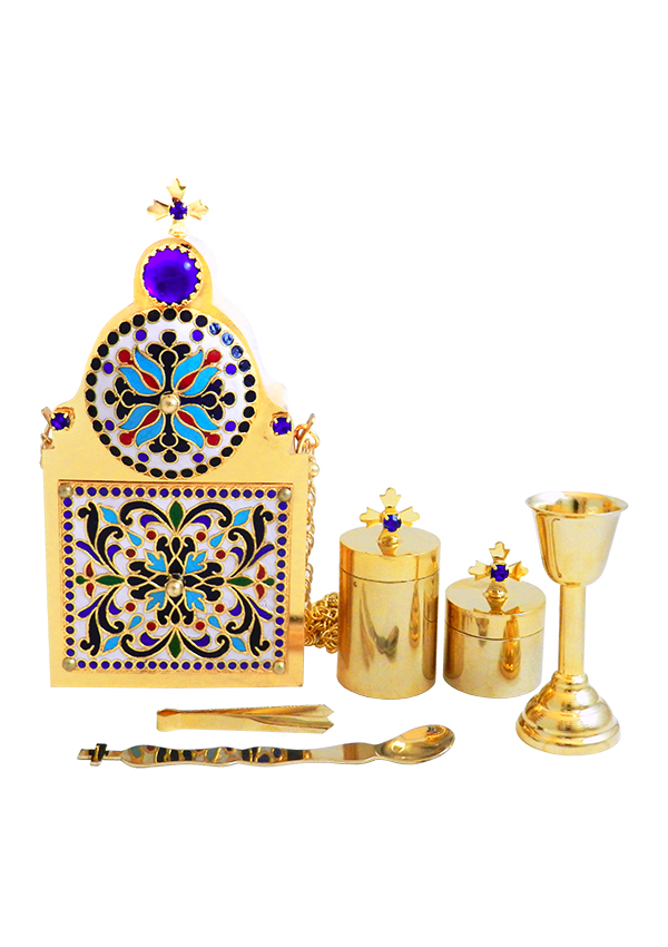 Conține Potir, linguriță, pensetă, 2 recipiente pentru sfânta împărtășanie.Obiecte bisericești Grecia